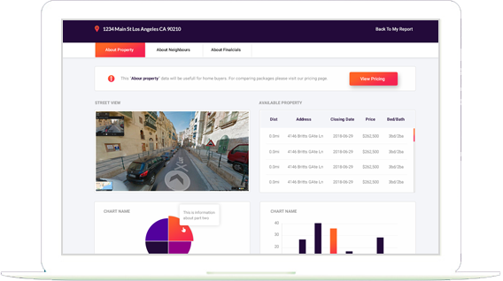 We provide property, neighborhood, and financial data for single-family homes in the US. Click "Get Started" for a free sample address.